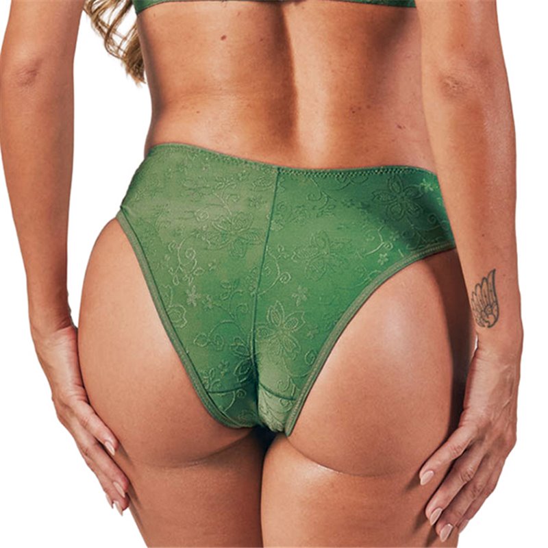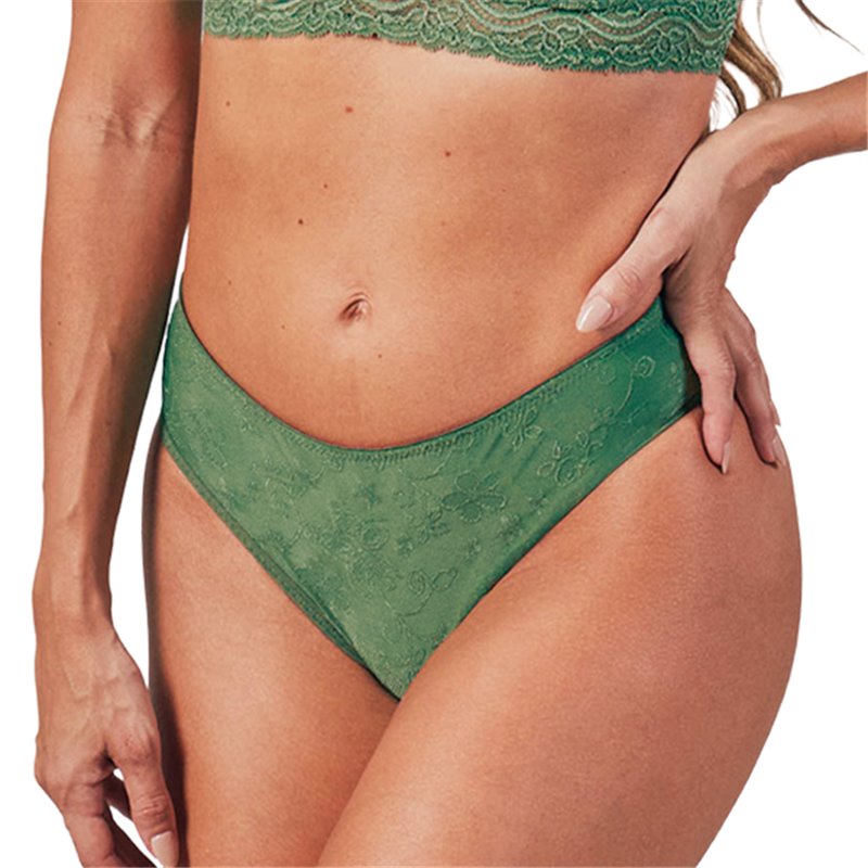 Calcinha estilo biquíni, com reforço frontal, confeccionado em especial fio LYCRA® trabalhada, com laterais largas, elásticos leves na cintura e nas pernas, que oferecem mais firmeza visando segurança sem perder o conforto ideal para o uso diário.