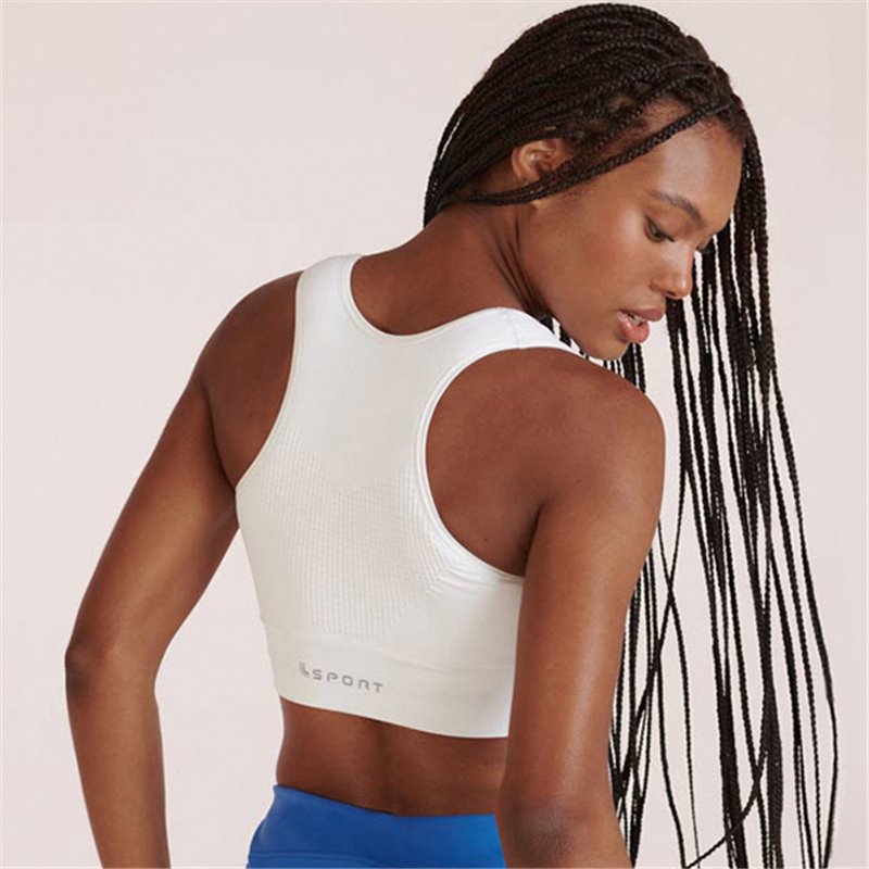 Busto anatômico e tecido com alta compressão, acomoda e sustenta os seios durante a prática esportiva.