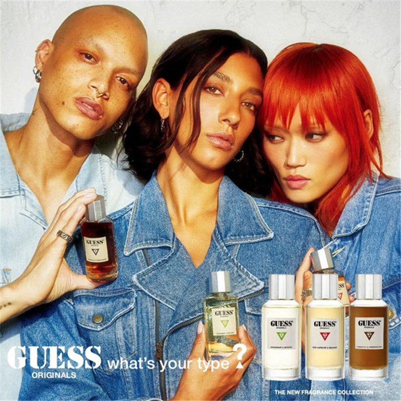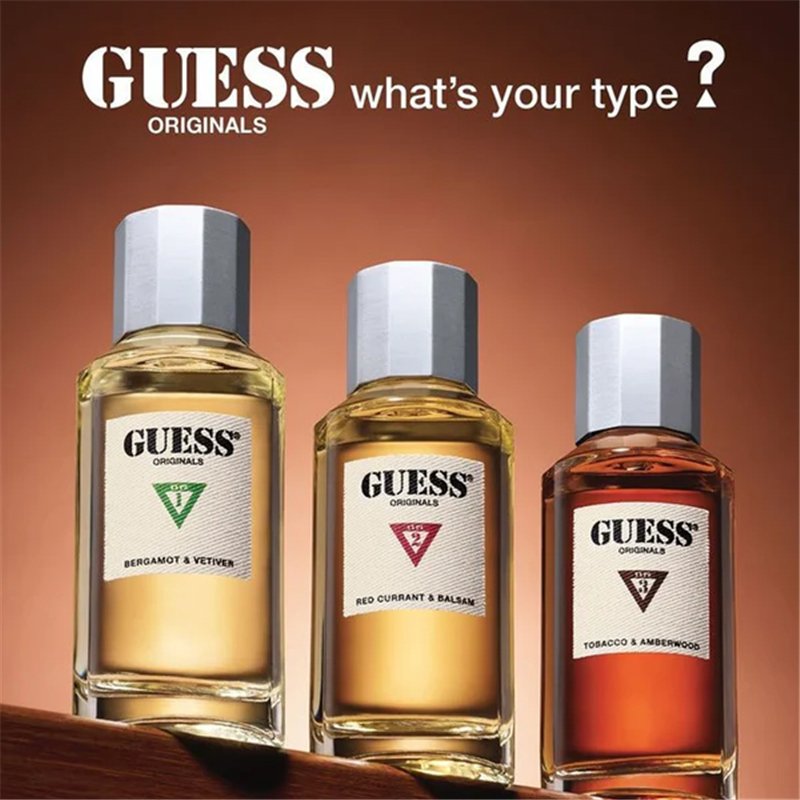 O Guess Originals Type 1 é um perfume compartilhável (unissex) EDP, com fragrância aromática e picante, caracterizada por notas brilhantes de bergamota, manjericão e tangerina, evoluindo para um coração de cardamomo, íris e lírio, com fundo de vetiver, almíscar e patchouli.